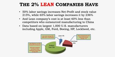 Lean's average labor savings is > 50%, reducing COGS by 7.5%, Overhead reduction of 27%, and Inventory Reduction of 67%, which frees up additional space for future business growth.